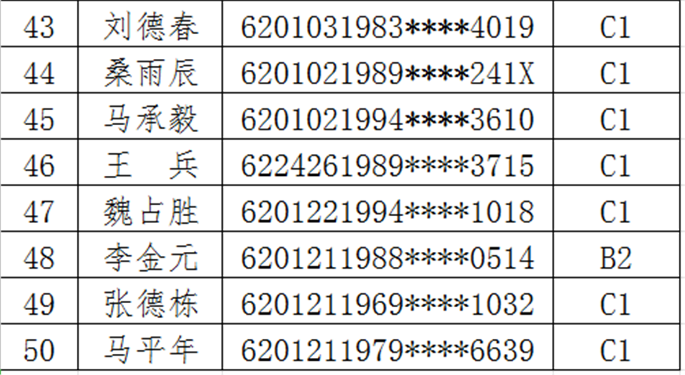 以下为50名醉驾司机名单: