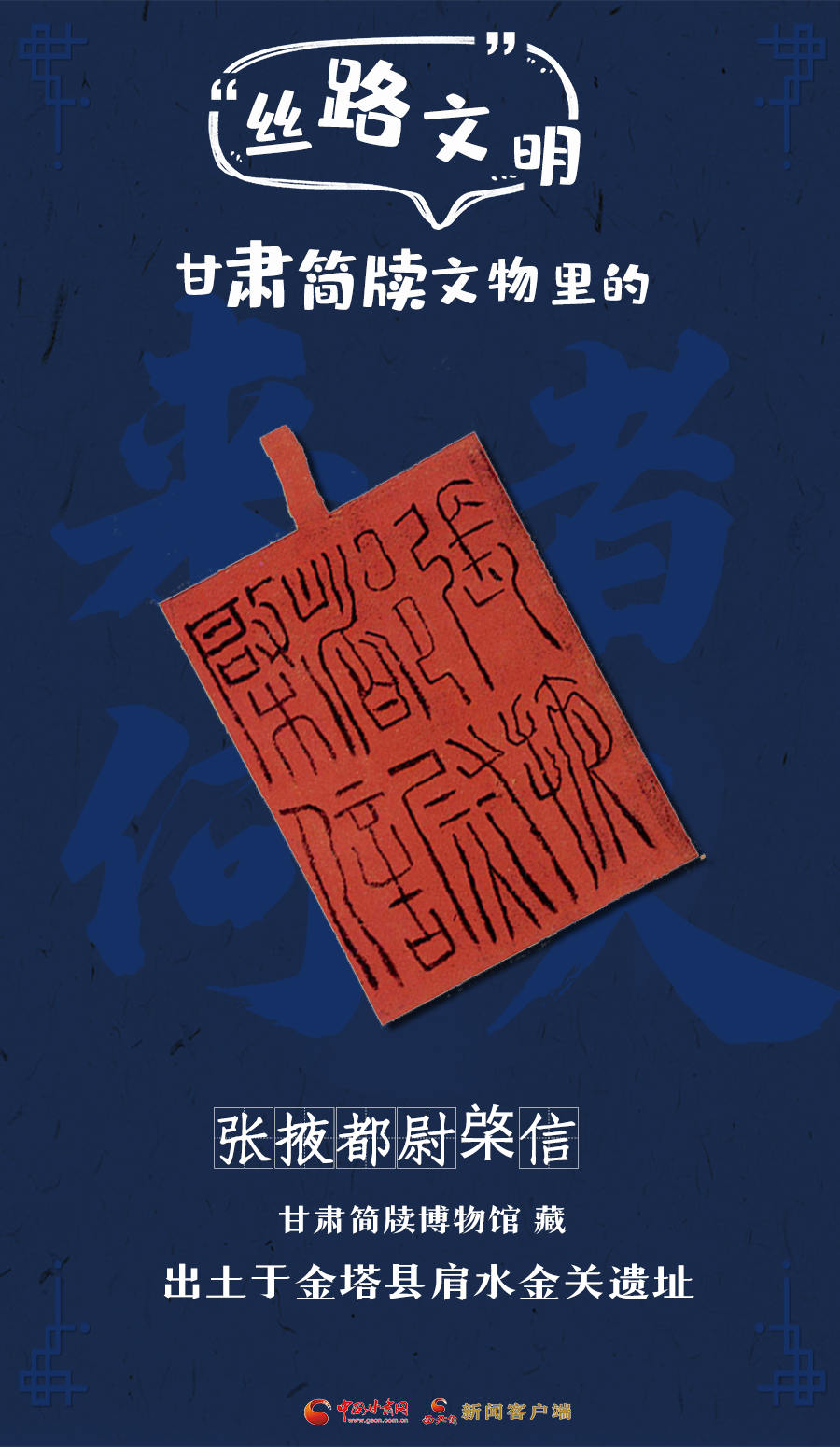 上方缀系,墨笔篆书“张掖都尉棨信”六字。文字简明,应属于幡信之类