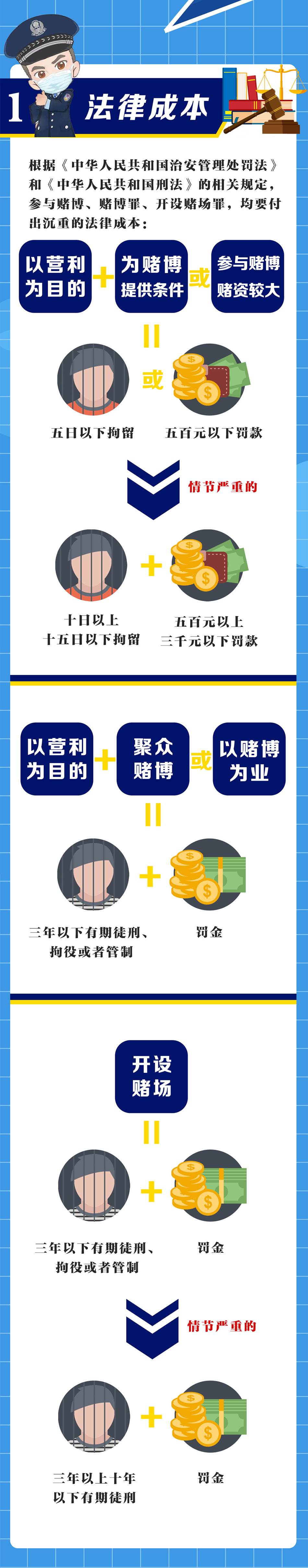 参与赌博轻者罚款、拘留,长期以赌为业或开设赌场的将被刑事拘留至判刑。