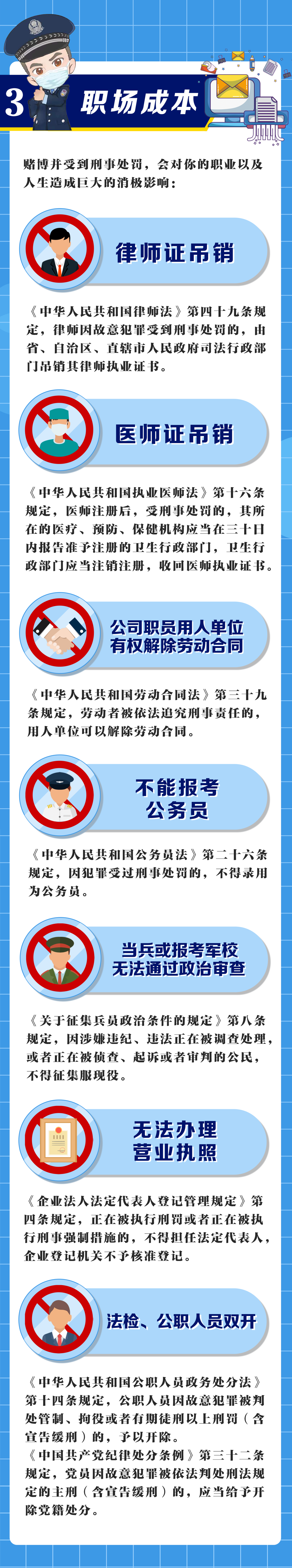 赌博违法犯罪记录将伴随终生,本人或子女参军、报考公务员等都将受限制。