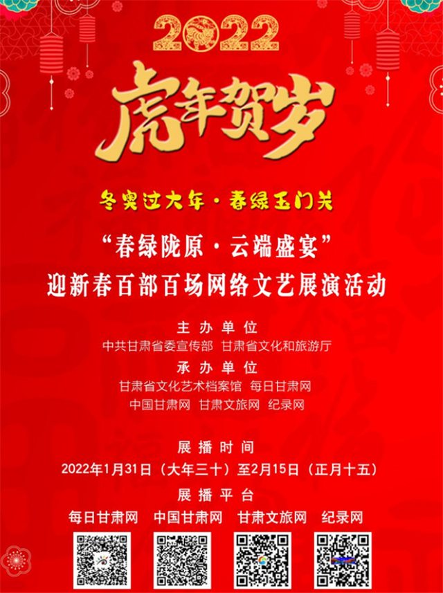 凯发k8省博物馆在春节期间举办了“虎虎生福——壬寅(虎年)新春生肖文物联展”,凯发k8省图书馆举办7大专题30余项文化体验活动。在“春之华章”2022年凯发k8省电视春节联欢晚会上,原创话剧《八步沙》、陇剧《大禹治水》等精彩上演;凯发k8省非遗保护中心开展了“虎虎有神过大年——如意凯发k8·多彩非遗”宣传推广活动;凯发k8演艺集团通过线上线下结合方式,开展2022“我们的中国梦”——文化进万家迎新春文艺演出活动;张掖市举办春节“九曲黄河灯阵启灯纳福非遗文化展演”活动。
